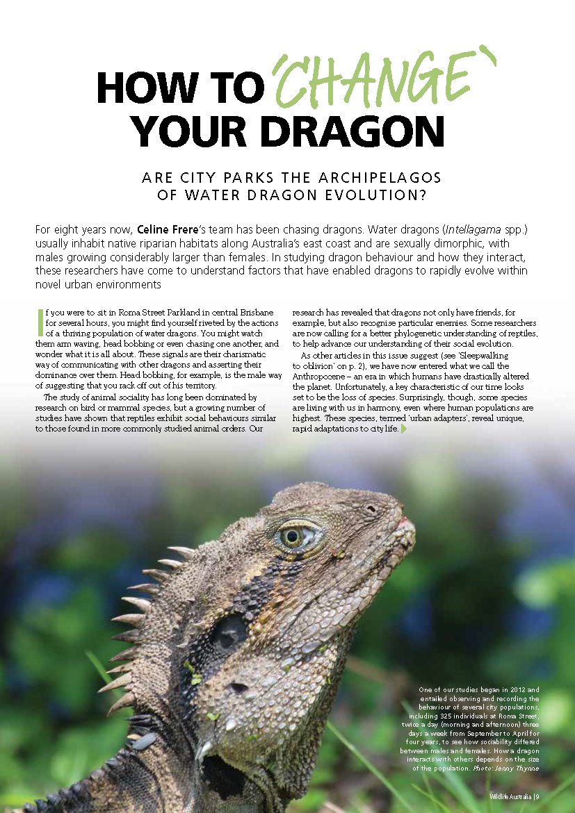 - Are city parks the archipelagos of water dragon evolution? In studying dragon behaviour and how they interact, Celine Frere and her team have come to understand factors that have enabled dragons to rapidly evolve within novel urban environments.
