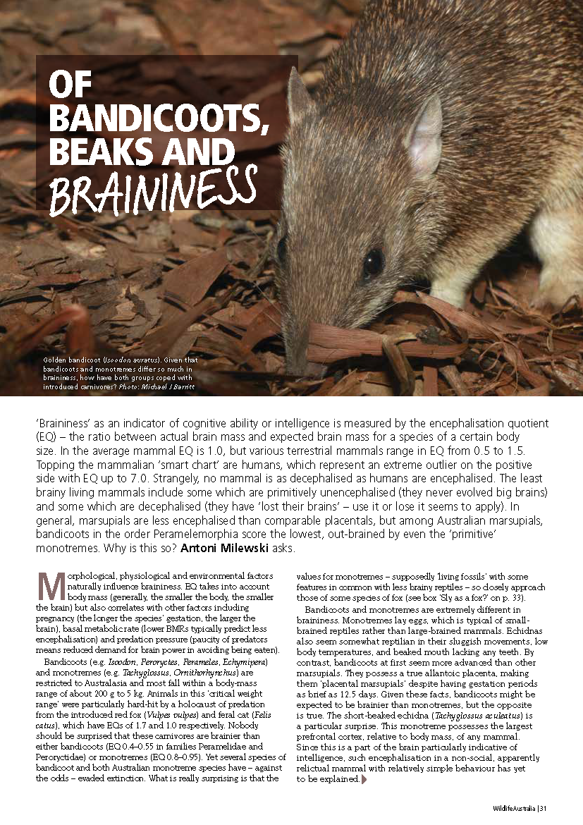 - In general, marsupials are less encephalised than comparable placentals, but among Australian marsupials, bandicoots in the order Peramelemorphia score the lowest for ‘braininess’, out-brained by even the ‘primitive’ monotremes. Why is this so? Antoni Milewski asks.