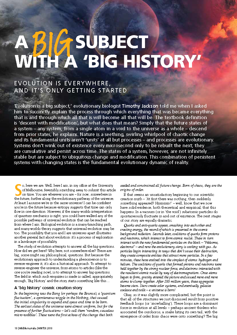 Things change – constantly. It’ s an obvious but powerful truth, and one that plays out in countless ways in the everyday lives of all of Earth’s inhabitants. Small changes may at first go unnoticed, but over time, cumulative change can result in something altogether different. Our cover image is of a water strider, an invertebrate that evolved to ‘walk on water’ and has long been considered a model subject for understanding evolutionary change and speciation. We, too, are constantly changing and adapting and, over time, evolving as a species – as Timothy Jackson explains in his article on the ubiquity of evolution on p. 18. Where will our evolution lead us, and where will it lead those with whom we share our planet?