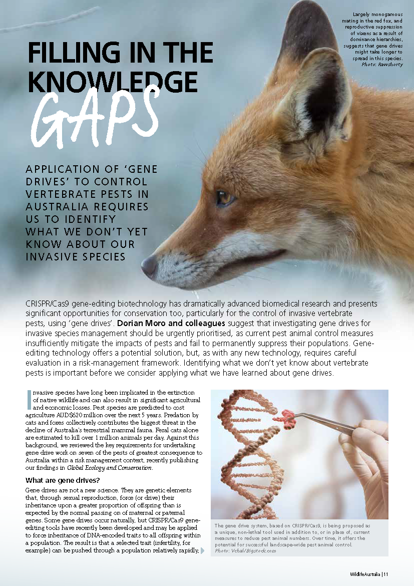 - CRISPR/Cas9 gene-editing biotechnology has dramatically advanced biomedical research and presents significant opportunities for conservation too, particularly for using ‘gene drives’ to control invasive vertebrate pests, Dorian Moro and colleagues explain.