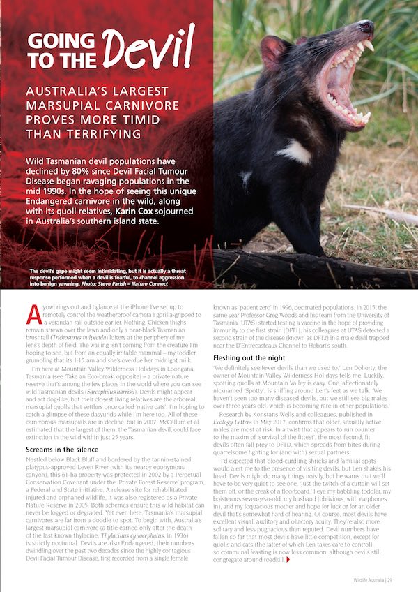 Wild Tasmanian devil populations have declined by 80% since Devil Facial Tumour Disease began ravaging populations in the mid 1990s. Karin Cox explores how private reserves, captive breeding programs, and new immunotherapy research are clawing this unique carnivore back from the brink.