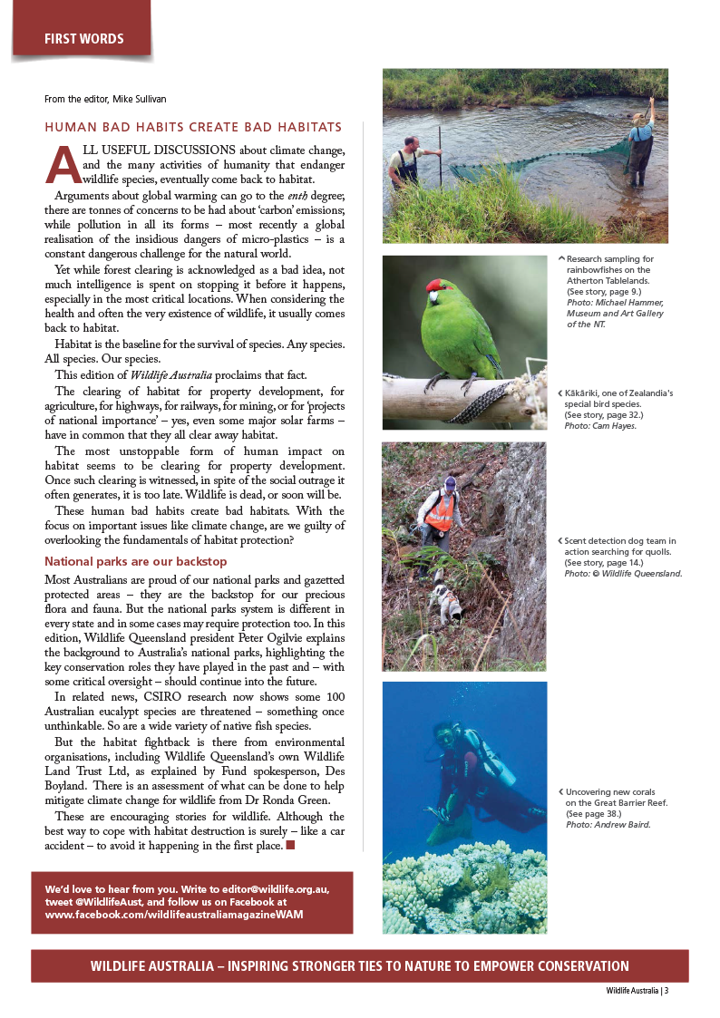 Habitat is the baseline for the survival of species. Any species. All species. Our species. This edition of Wildlife Australia proclaims that fact.